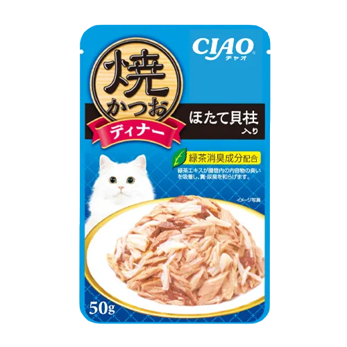 ปลาทูน่า หอยเชลล์ สารปรุงแต่งกลิ่นรส เจลลี่ คาราจีแนน กัวร์กัม วิตามินอี ฟรุกโตโอลิโกแซคคาไรด์ สารปรุงแต่งสี ผงชาเขียว