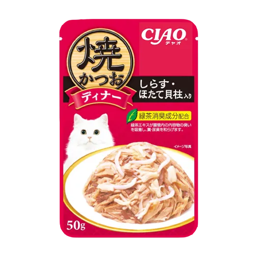 ปลาทูน่า สารปรุงแต่งกลิ่นรส หอยเชลล์ ปลาข้าวสาร เจลลี่ คาราจีแนน กัวร์กัม วิตามินอี ฟรุกโตโอลิโกแซคคาไรด์ สารปรุงแต่งสี ผงชาเขียว